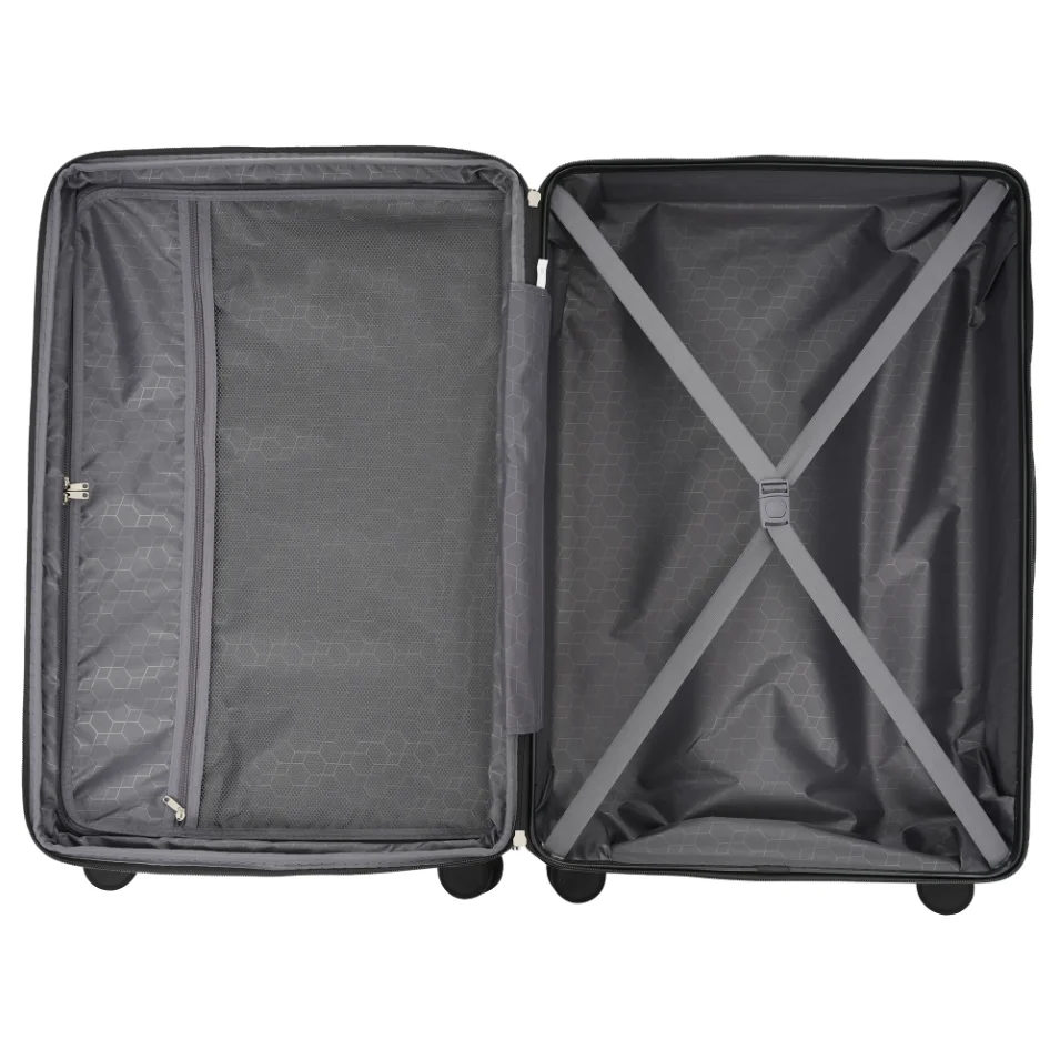 Viel Stauraum im Inneren: Das Innere des Koffers bietet ausreichend Stauraum für Ihre Kleidung, Schuhe, Toilettenartikel und andere Reiseutensilien. Darüber hinaus gibt es Netztaschen und Kreuzgurte, die Beim Ordnen und Ordnen von Gegenständen helfen.