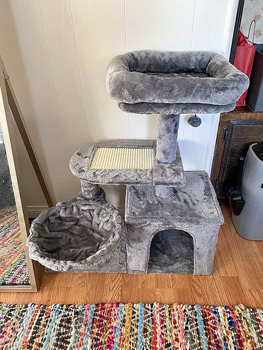 Exercise & Activity Complex: A small cat tree but have a 4 levels layout to explore, start from scratching the sisal covered post and probing the cat condo, next they can jump up to the hammock for a rest or on the condo to play with the dangling ball, indoor cats can also get exercised simply on this cat tower tree.