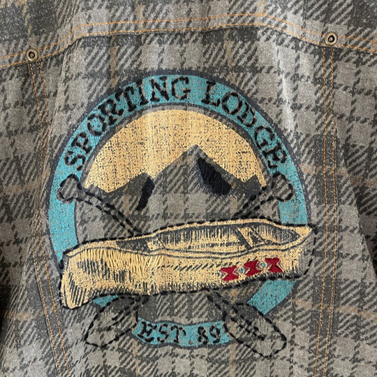 Large Embroidered "Sporting Lodge Est. '89" Patch with Canoe and Oars; Gold "Fishing Club Member" Patch on Sleeve.