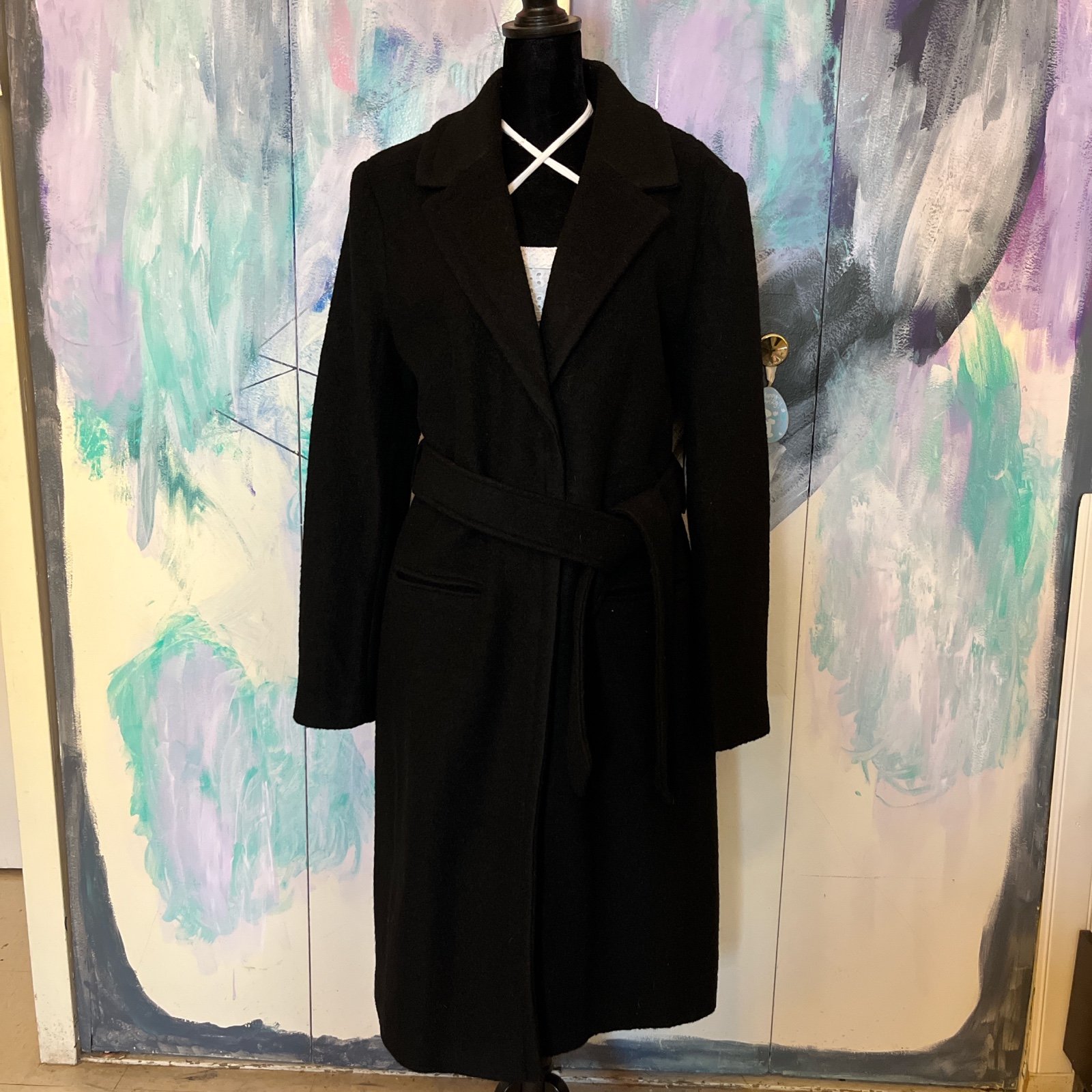 Black wool blend belted trench coat with collar and pockets