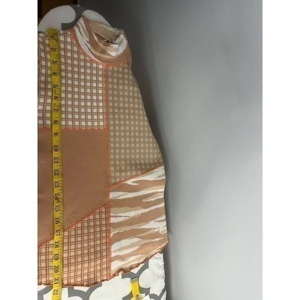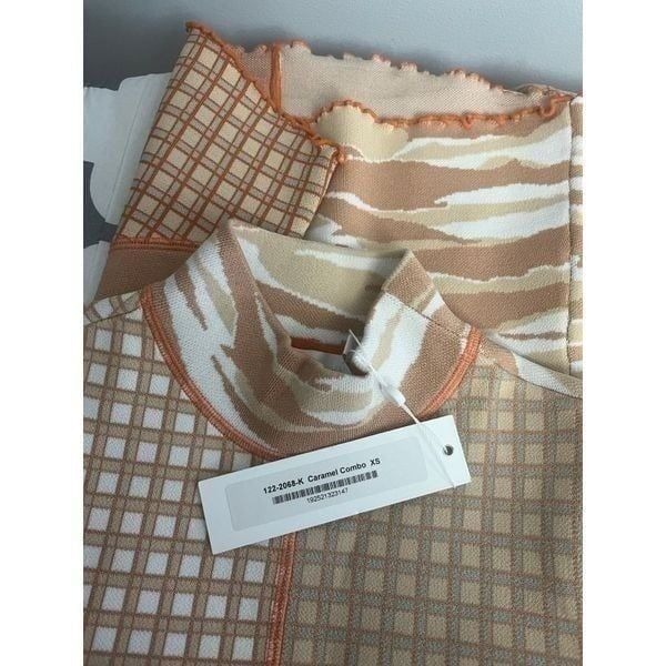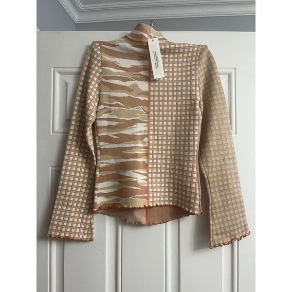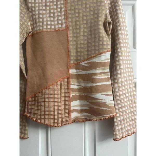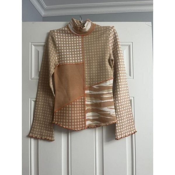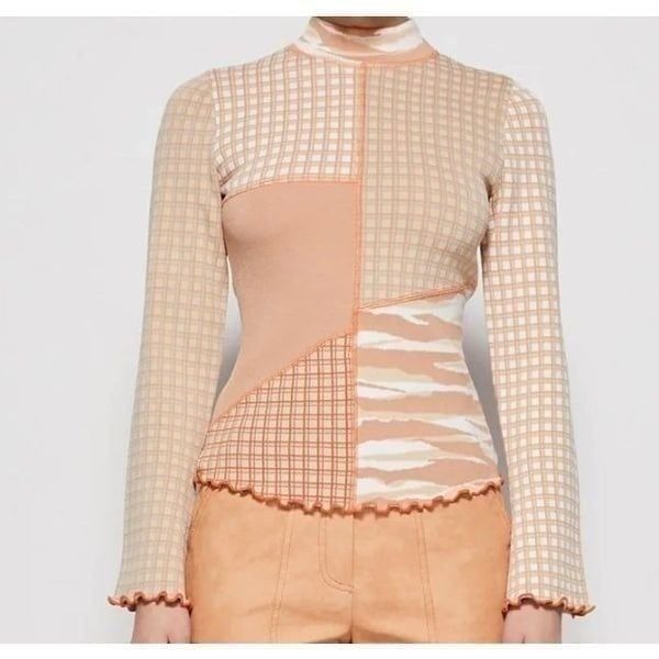 Knitted pullover, turtleneck collar and long sleeves adorned with frilled cuffs. Defined by contrasting, patchworked patterns, prints, and motifs for an eye catching play on color
