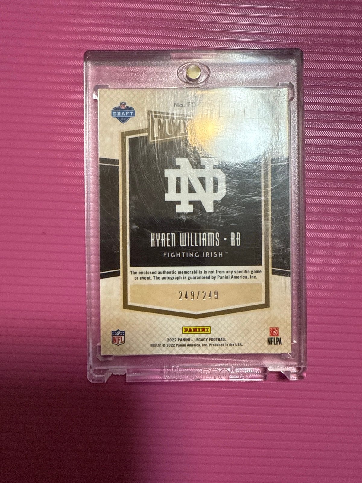 Kyren Williams Rookie Patch Auto from 2022 Panini Legacy Futures set. Features a bold blue on-card autograph and a two-color player-worn patch.