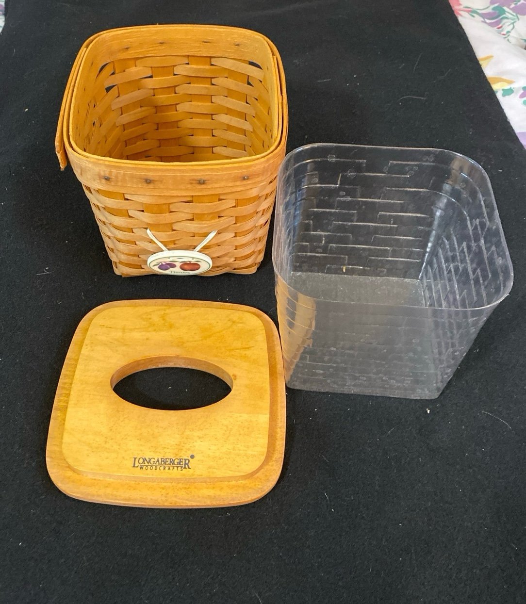 Longaberger 1997 tall tissue basket with woodcrafts lid and durable plastic protector. 7" height x 6.5"