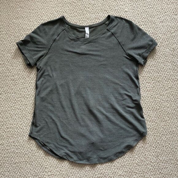 Excellent used condition Lululemon Open Up Tie Back Tee in Camo Green. The fabric is super soft honeycomb mesh with an open back detail that can be tied or left open. Very cute item.