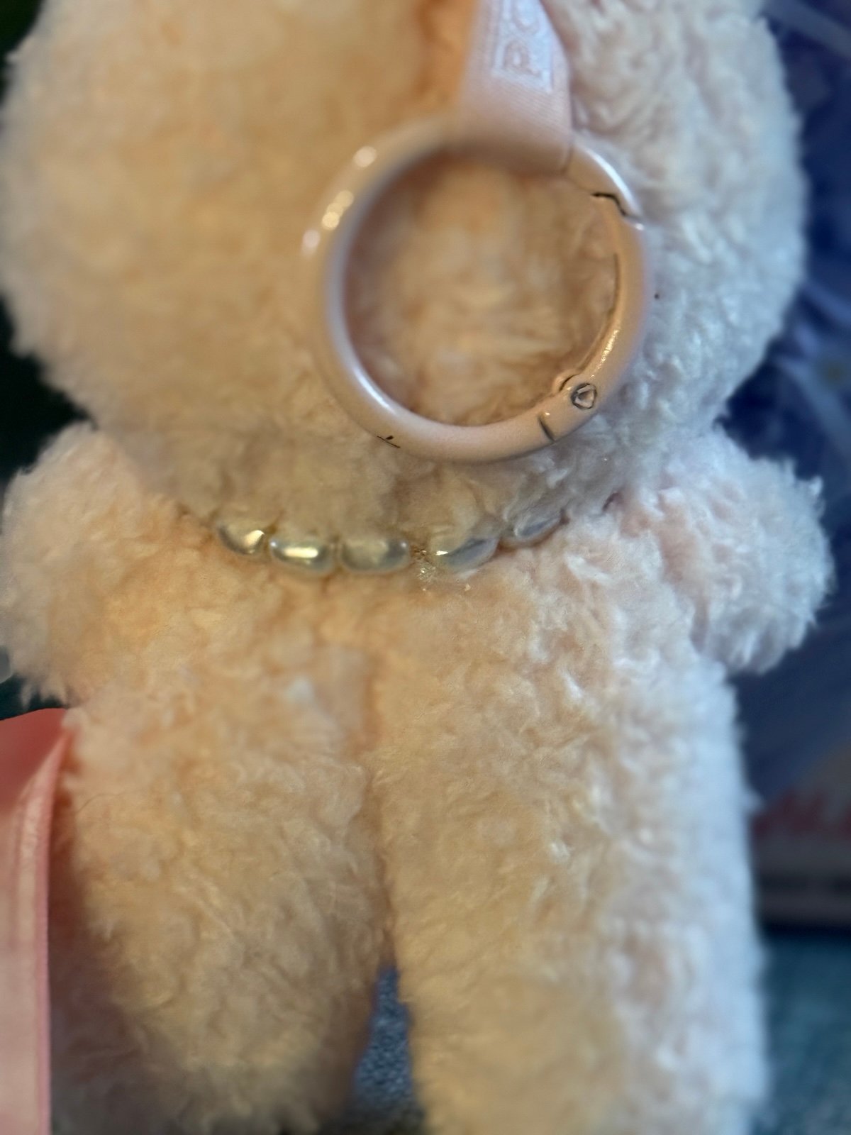 Vinyl hands, feet and and face. Notice in photos small mark on the ribbon attached to the key ring holder. I’m not sure what that is or where it came from. May be removable but don’t want to damage her.