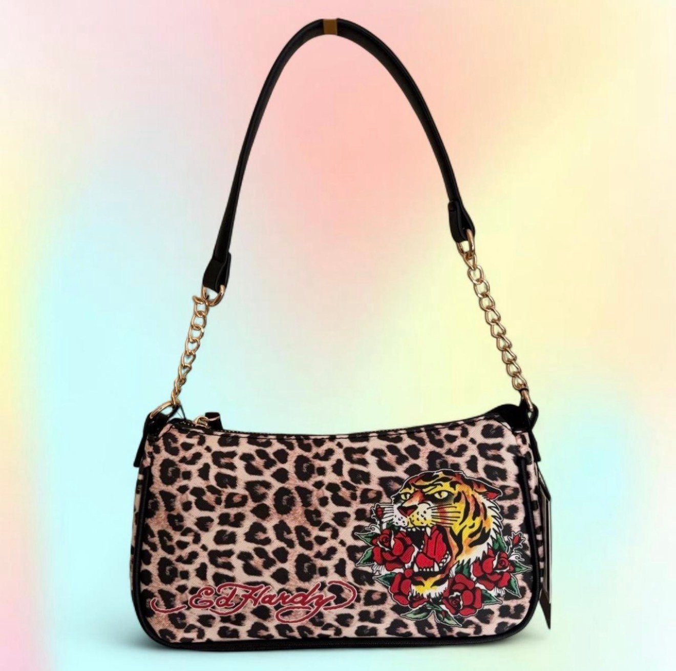 NWT Beautiful Ed Hardy Leopard Shoulder Purse with gold detail! has an extra zippered pocket on the outside and has an extra pocket on the inside, also has an extra removable/adjustable crossbody strap #y2k #donedhardy #deadstock #grunge #coquette