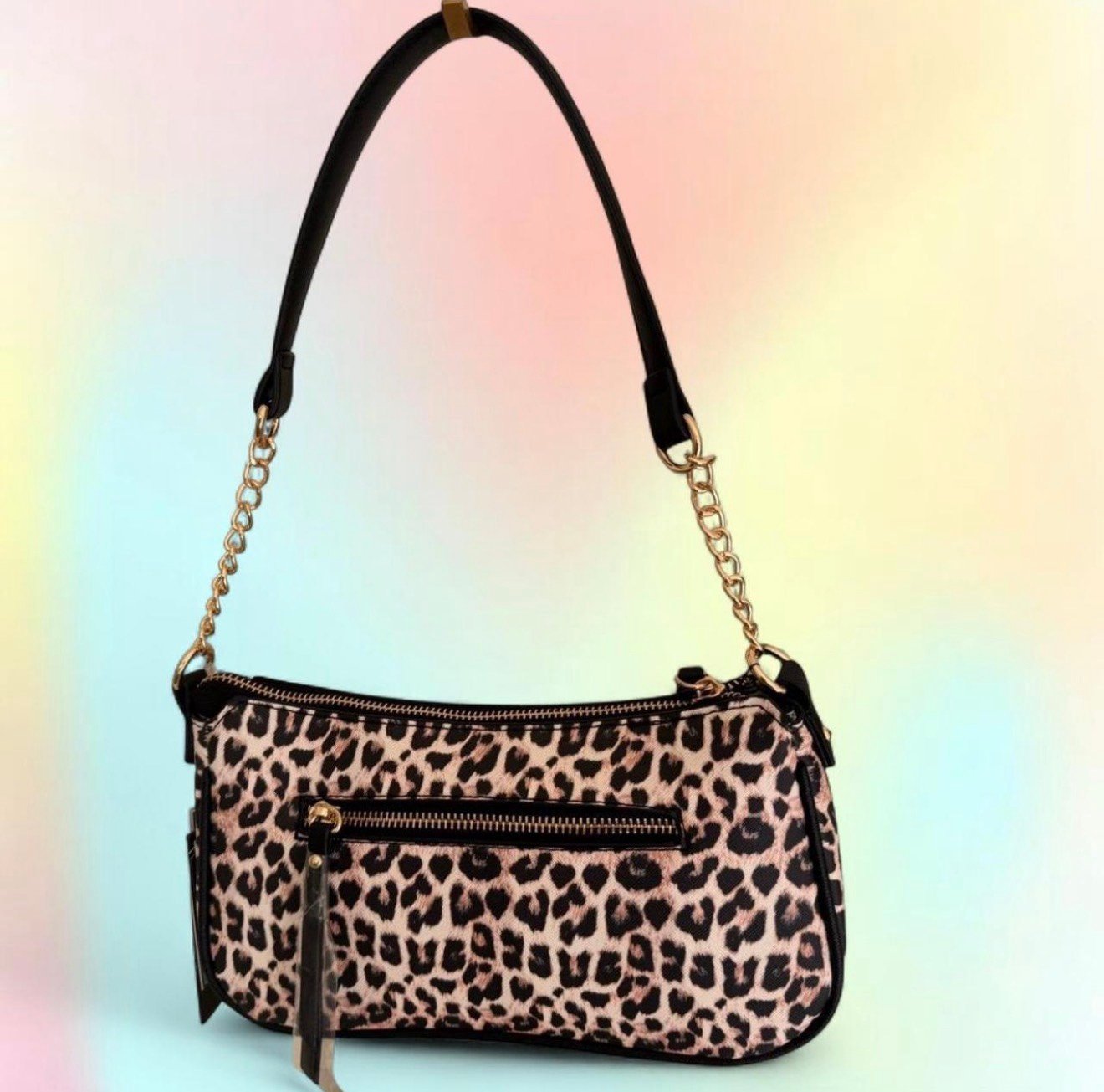 leopard print, gold accents, shoulder bag, zippered pocket, Y2K style, grunge aesthetic, distressed leather, compact purse, trendy accessory, bold pattern