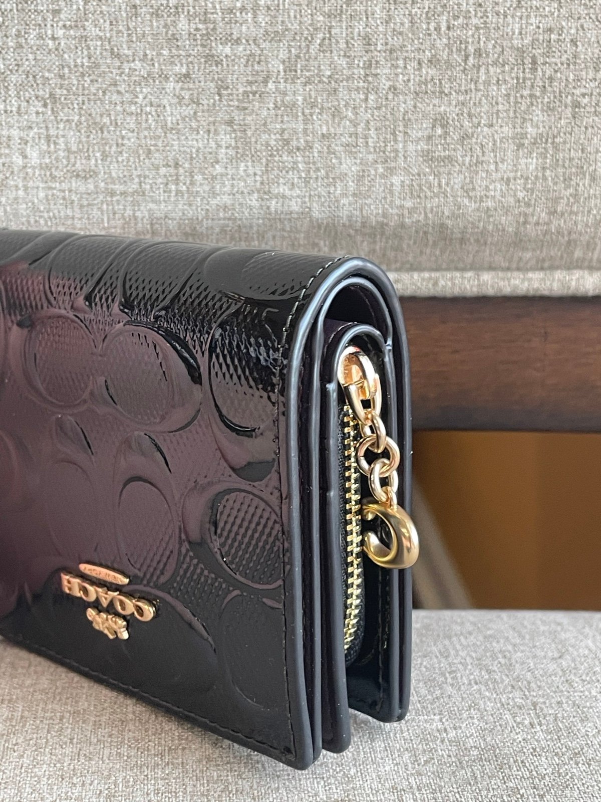 | Signature patent leather | Three credit card slots | ID window | Full-length bill compartment | Snap closure | Outside zip coin pocket | 4 1/4" (L) x 3 1/2" (H) x 1" (W)|Style No. CV415|