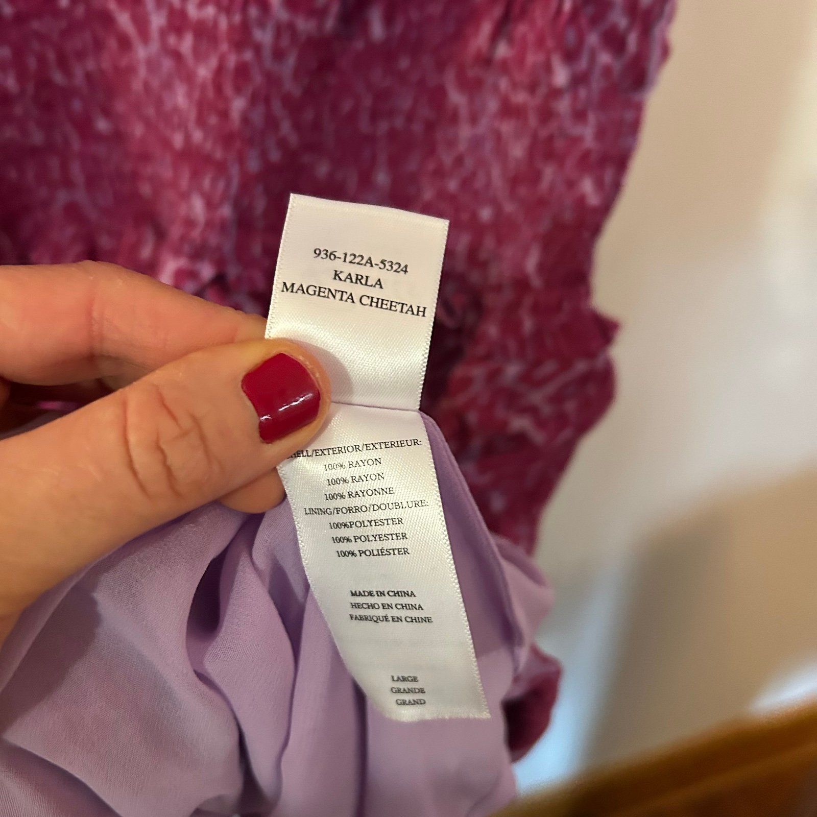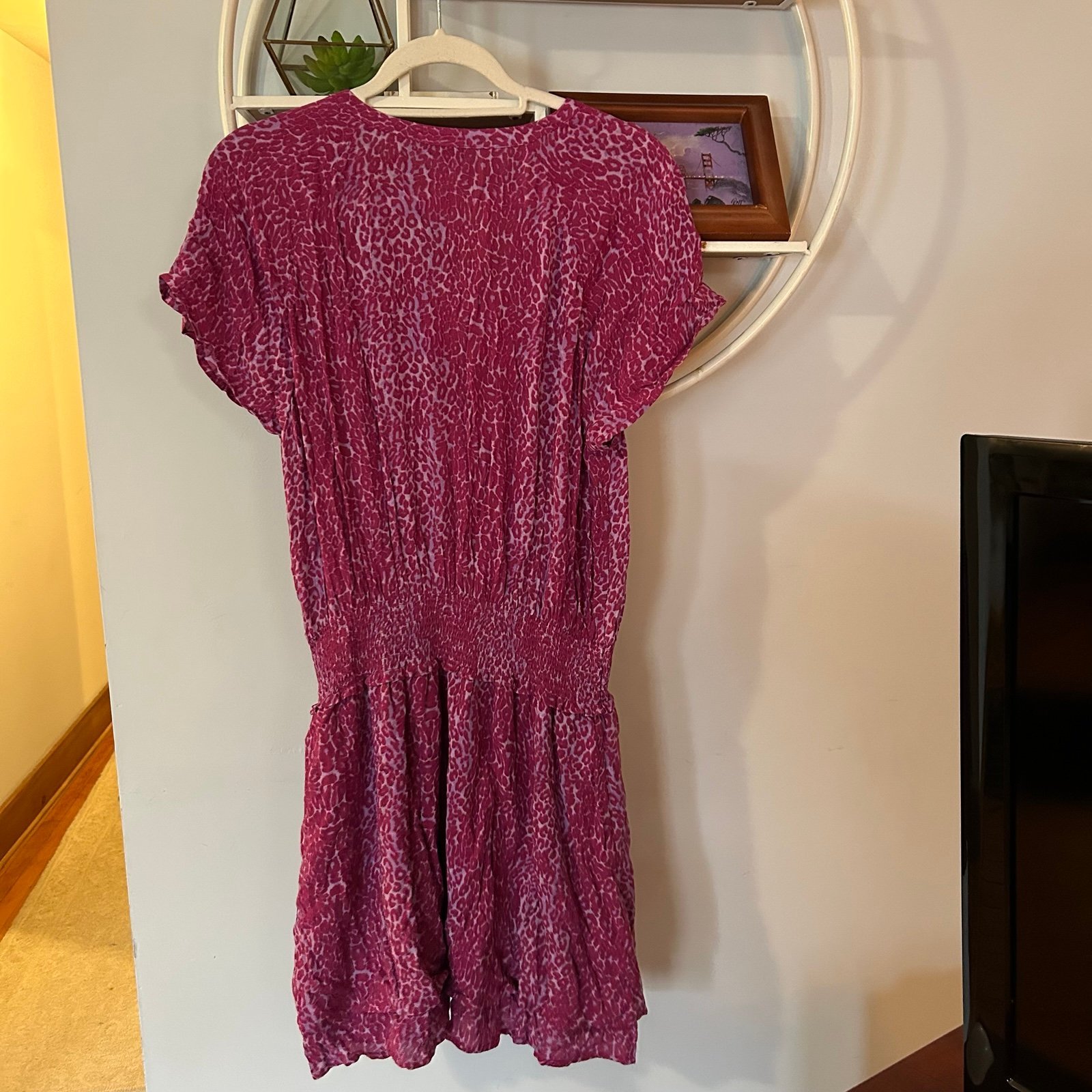 Lightweight rayon crepe, short sleeve, unlined, blush pink mini dress featuring multicolor snake print throughout, front loop buttons, v-neckline, cap sleeves, smocked waistline, double layer tiered skirt.