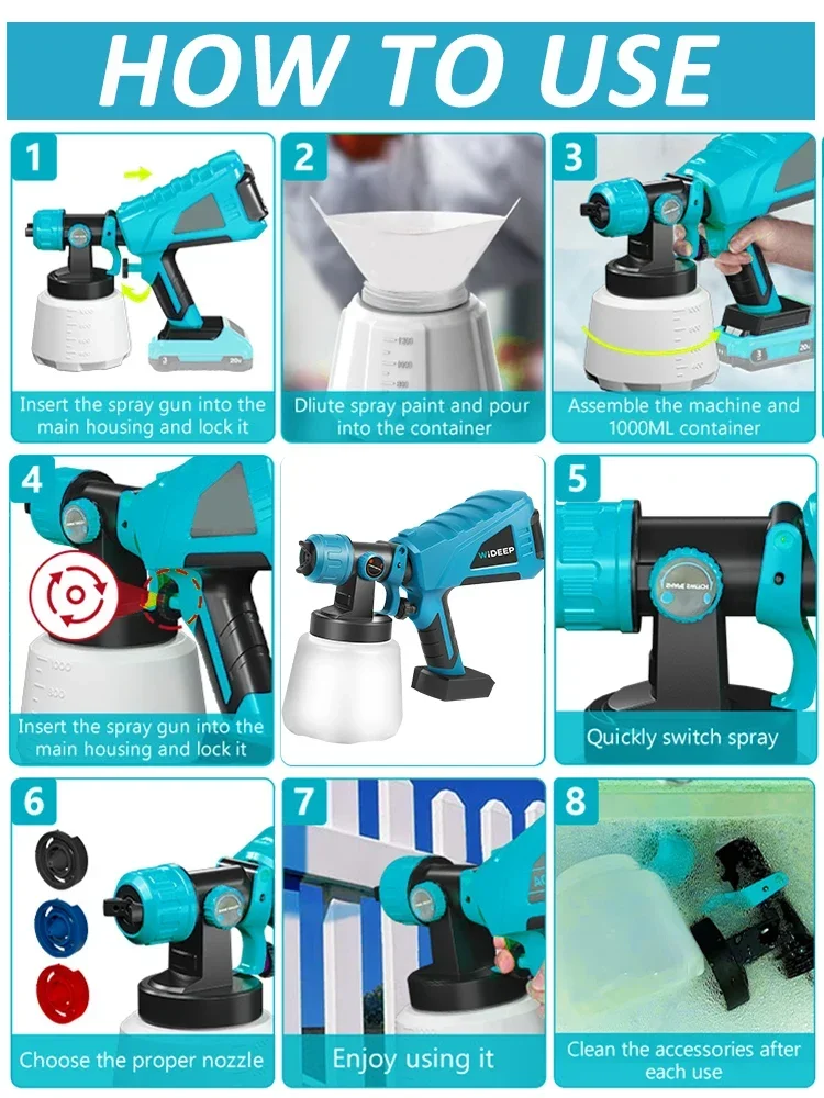 【Easy to Use & Clean】 - This electric painting gun is user-friendly,easy assemble and easy spraying.All parts of the sprayer can be easily disassembled,so you can complete the cleaning work easily and efficiently.(Warm notice:The spray gun should be cleaned immediately after spraying to prevent paint dries at the nozzle,clogging the sprayer.After the first stage cleaning,please fill the container with clean water and spray it for 30-60 seconds to remove paint from the valve core.)