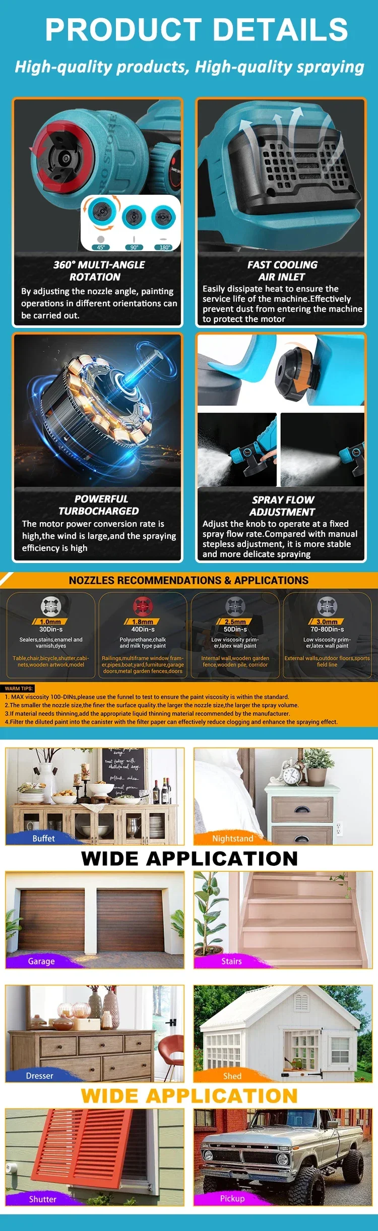 【3 Spraying Methods】 - The electric spray gun is equipped with 3 different spraying methods (horizontal,vertical and circular spraying).You can choose the most suitable mode according to different spraying projects.The spray gun comes with a preinstalled 1.0mm nozzle, with the other two (1.8mm,2.5mm) in the box. Flow control knob on the trigger back manages the flow rate of different liquids with the viscosity ≤ 120 Din-s.