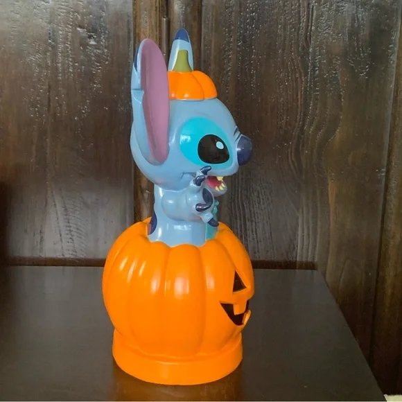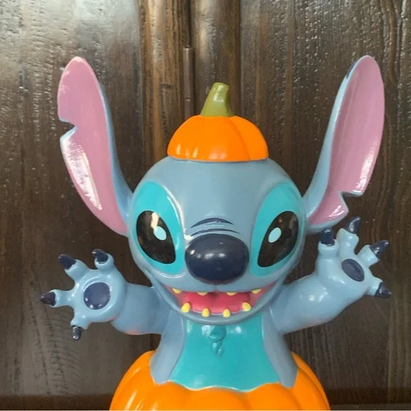This is a beautiful Halloween figurine from the Disney Lilo & Stitch Collection.Gorgeous colors and detailed spooky design featuring Stitch jumping out of a Jack O’Lantern pumpkin. Excellent detail in the colors, facial features and Jack O’Lantern. Perfect for any Disney lover and makes a wonderful addition to any Stitch themed or Halloween decor display. Stands approximately 11” tall. Brand new and in excellent condition. Comes from a smoke free home.