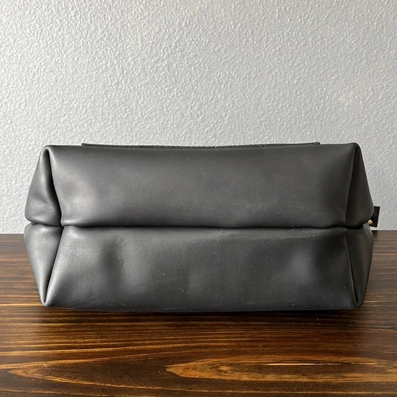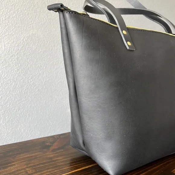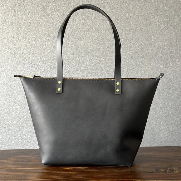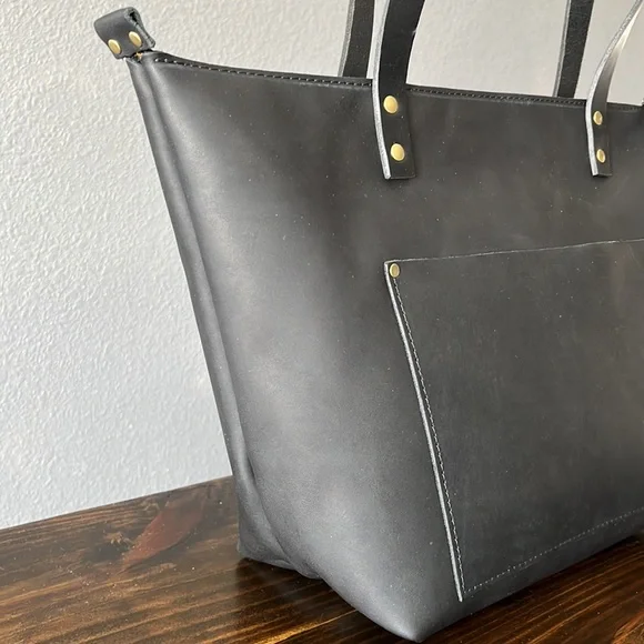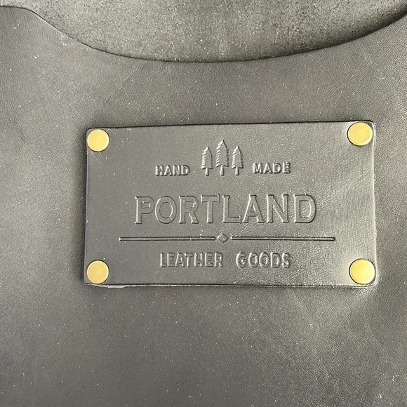 Hi, Up for sale is a very special NEW Portland Leather Goods Tote in Black with Black Handles and a special hide number stamped in the interior. Versatile for year round use! Impeccable Portland Leather Goods quality that will last a lifetime.Sturdy English Bridle handles that soften over timeExterior and interior pocket - perfect for your phone and other small itemsAntiqued brass rivets look great with both silver and gold accessoriesHandy key loop with durable logo snapLARGE: Fits a water bottle, snacks, book, wallet, sunglasses, back-up shirt, and a 15” Macbook snugly. Measures 11” wide across the base, 18” wide across the top, 6” deep, and 12” tall.