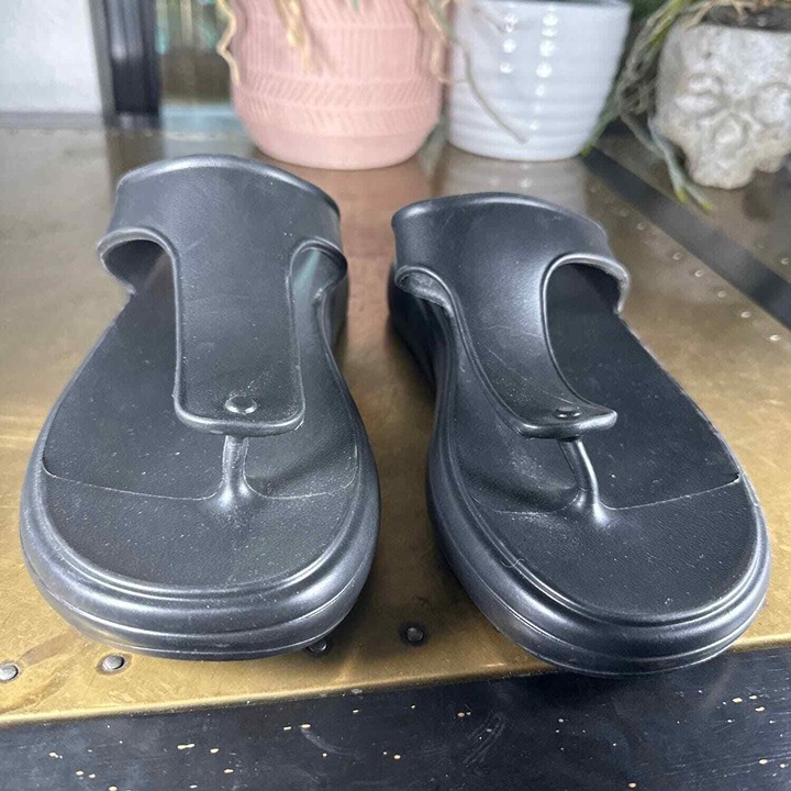 Features: T-strap thong construction, slip-on design, contoured footbed, round toe