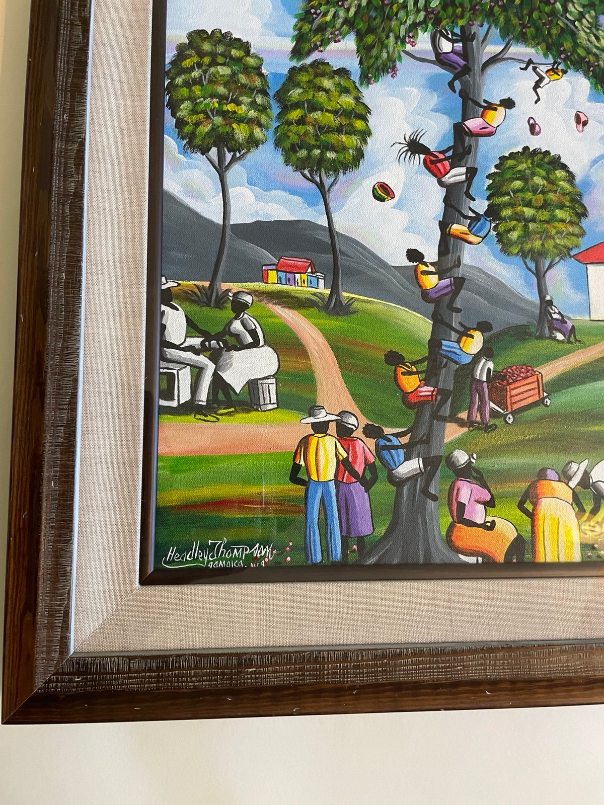 This beautiful ,48 by 36 in, painting titled "Tree Climbers" by Headley Thompson is a stunning addition to any art collection. The piece depicts a tree with intricate details and a unique style that is sure to captivate any viewer. The painting is perfect for those who appreciate the beauty of nature and art.